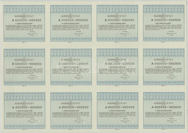 Leírás: 1997. "A Katlan Befektetési Részvénytársaság" háromezernégyszáz darab részvénye egyben, összesen 10.000Ft-ról, "MINTA" perforációval + Budapest 1994. "Benczúr 47 Büroház Rt" névre szóló részvény 1.000.000Ft értékben, hátoldalon bélyegzéssel T:I