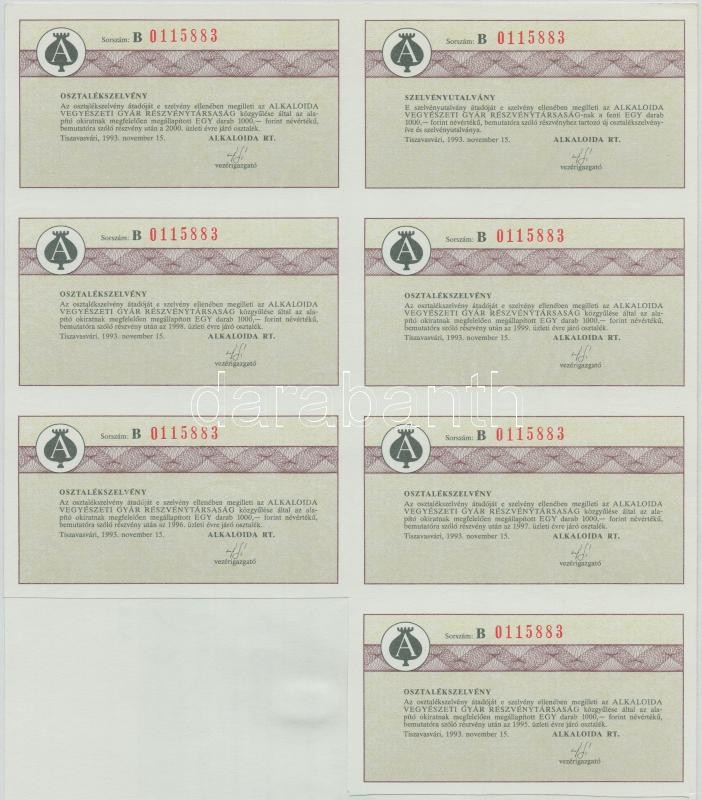 Tiszavasvári 1993. "Alkaloida Vegyészeti Gyár Részvénytársaság" részvénye 1000Ft-ról (2x), sorszámkövetők, magyar és angol nyelvű, szárazpecséttel és szelvényekkel T:I-