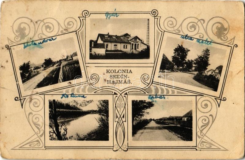 Szőgyén-Hajmás, Kolonia Sedín-Hajmás, Svehlovo, Nové Osady (Nagyfödémes, Velké Úlany); Iskola, Szeszgyár, lepárló, utcakép, Kis-Duna, lakások / school, distillery, street view, Maly Dunaj, apartment blocks. Art Nouveau (gyűrődések / creases)