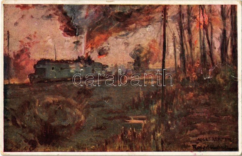 Russischer Panzerzug im österr. Feuer. Offizielle Karte für Rotes Kreuz, Kriegsfürsorgeamt Kriegshilfsbüro Nr. 442. / K.u.K. military art postcard, Russian panzer train (armored train), artist signed (crease)