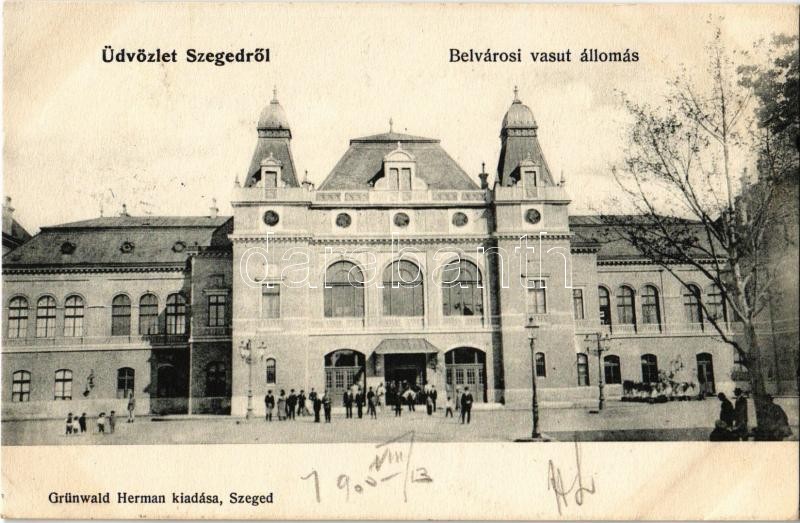 1905 Szeged, Belvárosi vasútállomás. Kiadja Grünwald Herman (kissé ázo... https://www.darabanth.com/hu/352-Gyorsarveres/352.0/Kepeslapok/Magyarorszag~1000004/1905-Szeged-Belvarosi-vasutallomas-Kiadja-Grunwald-Herman-kisse-azott-sarok-slightly-wet~II2005445