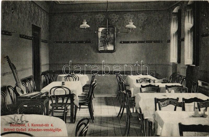 1913 Budapest I. Tabán, Schreil Győző Albecker vendéglője. Kereszt tér... https://www.darabanth.com/hu/352-Gyorsarveres/352.0/Kepeslapok/Magyarorszag~1000004/1913-Budapest-I-Taban-Schreil-Gyozo-Albecker-vendegloje-Kereszt-ter-4-belso~II2007753