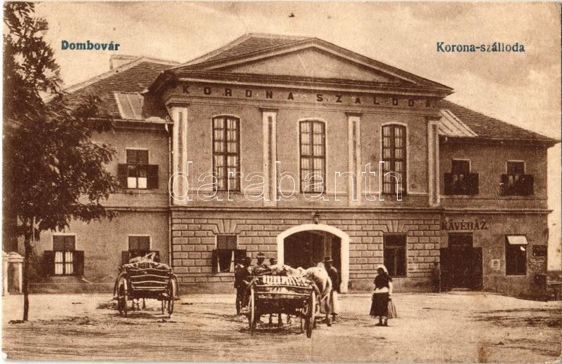 1918 Dombóvár, Korona szálloda, kávéház (EK) https://www.darabanth.com/hu/352-Gyorsarveres/352.0/Kepeslapok/Magyarorszag~1000004/1918-Dombovar-Korona-szalloda-kavehaz-EK~II2006768