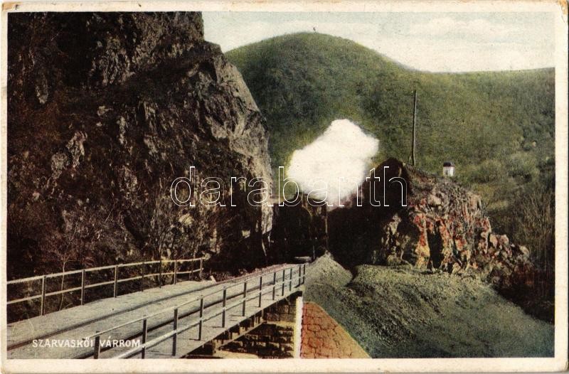 Leírás: 1941 Szarvaskő, várrom, vasúti bevágás, gőzmozdony, vasúti híd. Baross nyomda (EK)