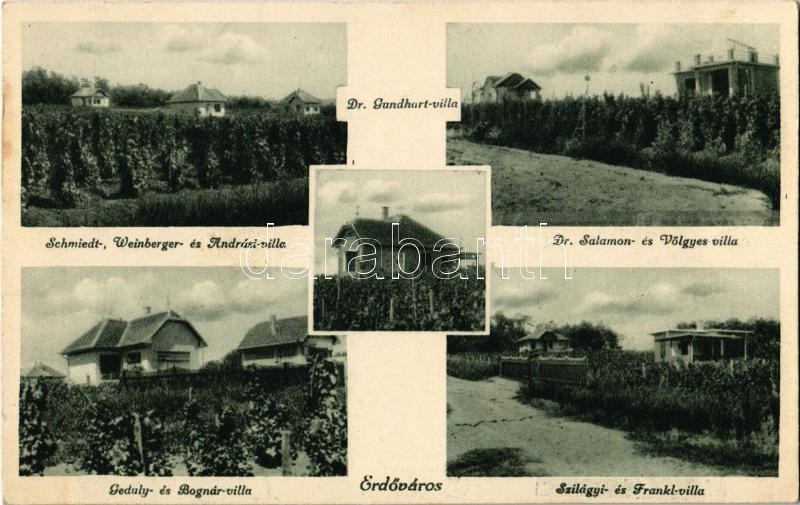 Leírás: Erdőváros (Erdőkertes), Schmiedt, Weinberger, Andrási, Geduly, Bognár, Szilágyi, Dr. Gundhart, Frankl, Dr. Salamon és Völgyes villa, szőlőskertek