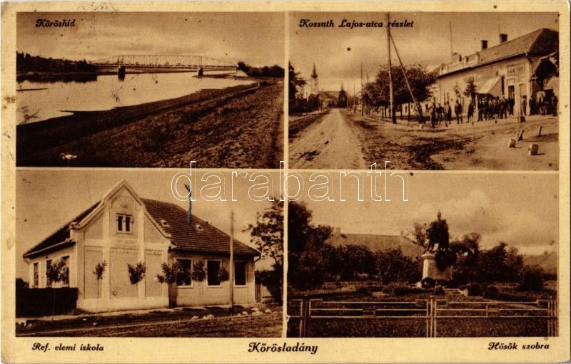 Leírás: Körösladány, Körös híd, Kossuth Lajos utca, üzlet, Református elemi iskola, Hősök szobra, emlékmű. Czibulka Béla kiadása (EK)