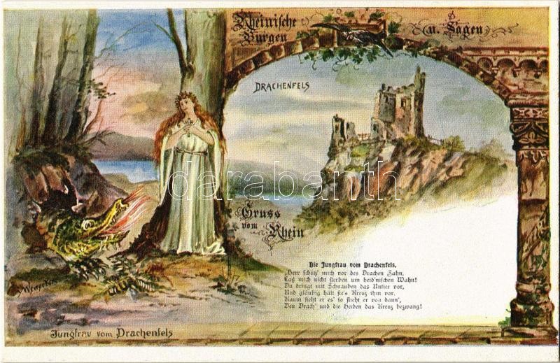 Leírás: Königswinter, Burg Drachenfels, Jungfrau vom Drachenfels; Rheinische Burgen und Sagen, Josef Wewerka / lady, dragon, castle, Art Nouveau s: Wewerka