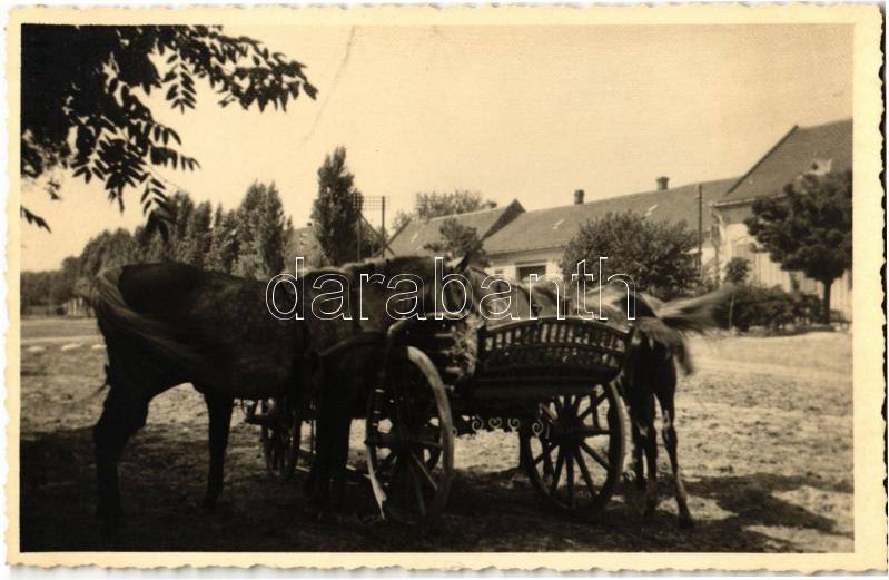 Leírás: 1941 Nagykárolyfalva, Károlyfalva, Karlsdorf, Banatski Karlovac; Wagen / szénás szekér lovakkal / hay wagon with horses. photo