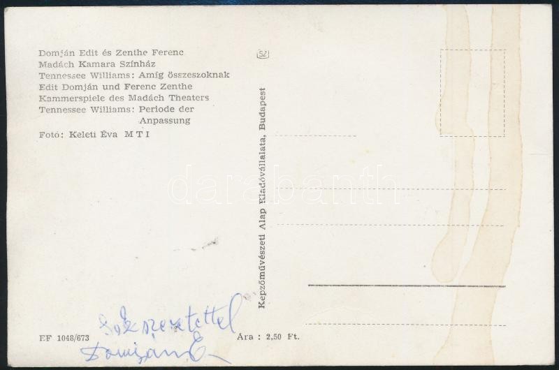 Leírás: Domján Edit (1932-1972) színésznő aláírása egy őt és Zente Ferencet ábrázoló képeslap hátoldalán