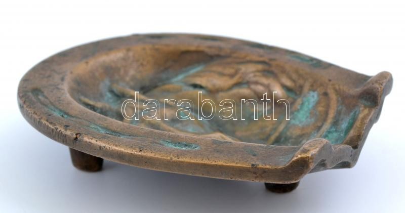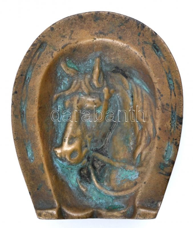 Leírás: Bronz patkó alakú, lófej díszítésű asztaldísz, patinával, 11x9x2,5 cm