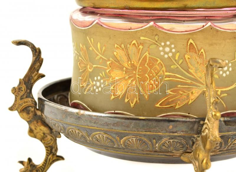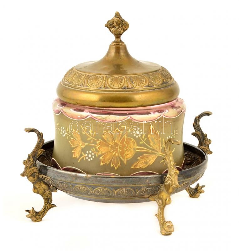 Díszes talpas alpakka bonbonier, festett üvegbetéttel, jelzés nélkül, kopásnyomokkal, foltokkal, két lába laza, m: 14 cm, alpakka talp: d: 15 cm, üveg: m: 8,5 cm, d: 11 cm.