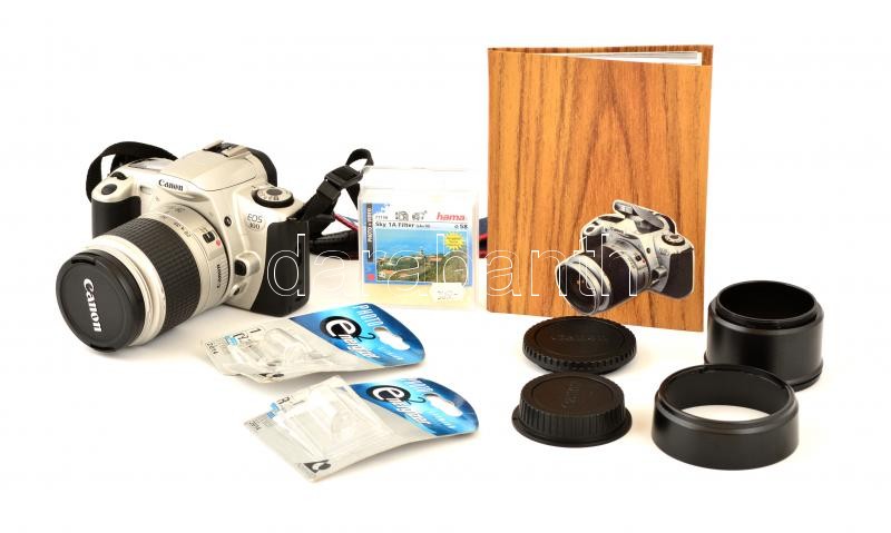 Canon EOS 300 filmes SLR fényképezőgép, Canon 28-90 mm f/4-5.6 objektívvel, kiegészítőkkel, leírással, szép, működő állapotban, friss elemekkel / Canon SLR film camera, with accessories, in good, working condition, with batteries