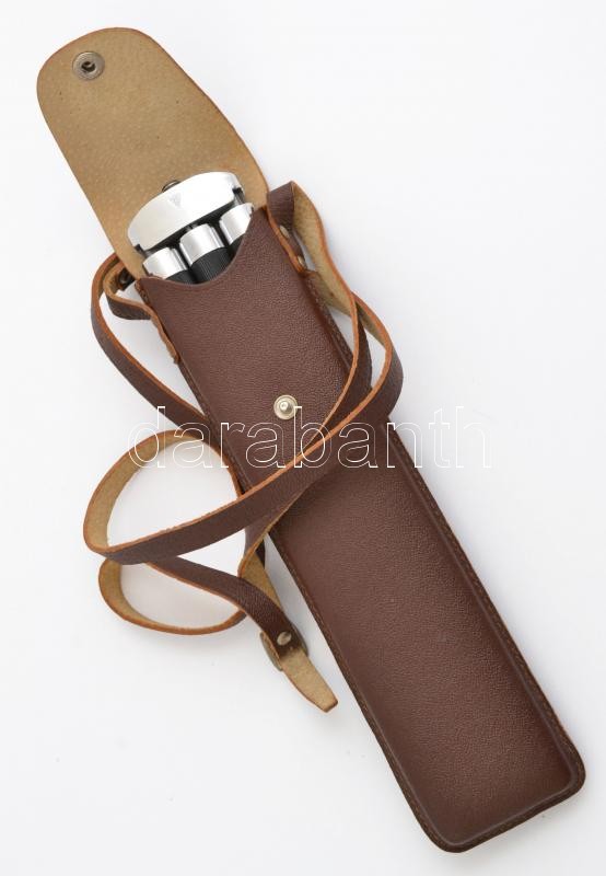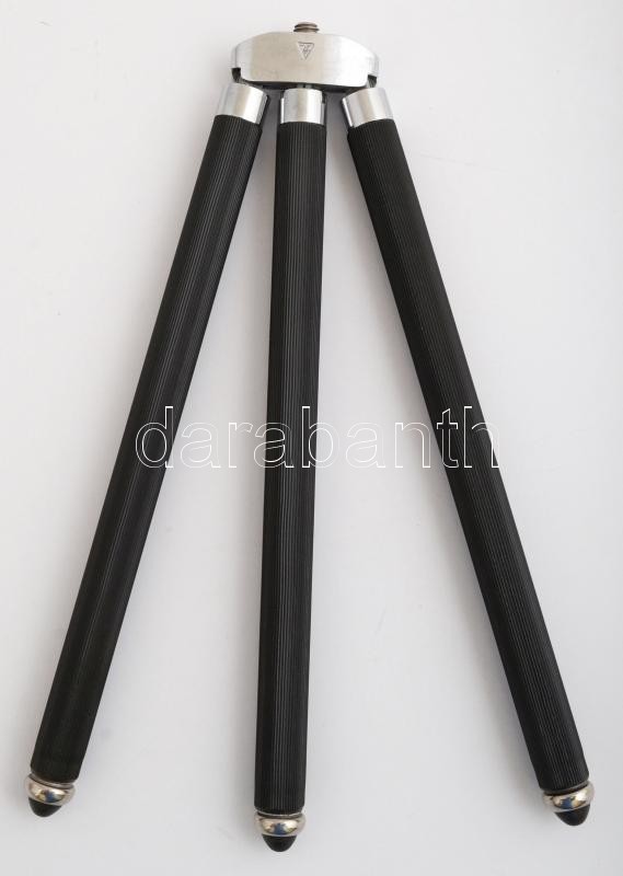 Leírás: Régi fotós állvány, kihúzható lábakkal, bőr tokban, egy láb kijár, összecsukva: 28,5 cm, kihúzva: 104 cm.