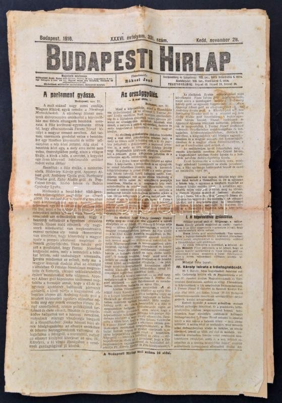 Leírás: 1916 november 28. A Budapesti Hírlap Ferenc József haláláról -. parlamenti gyász beszámoló száma