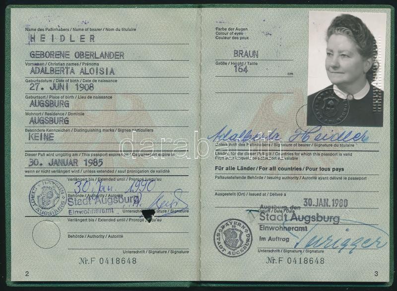 1980 Fényképes NSZK-s útlevél, bejegyzésekkel https://www.darabanth.com/hu/352-Gyorsarveres/352.0/Mutargy-papirregiseg-egyeb/Okmanyok~500017/1980-Fenykepes-NSZK-s-utlevel-bejegyzesekkel~II2008592