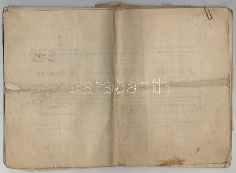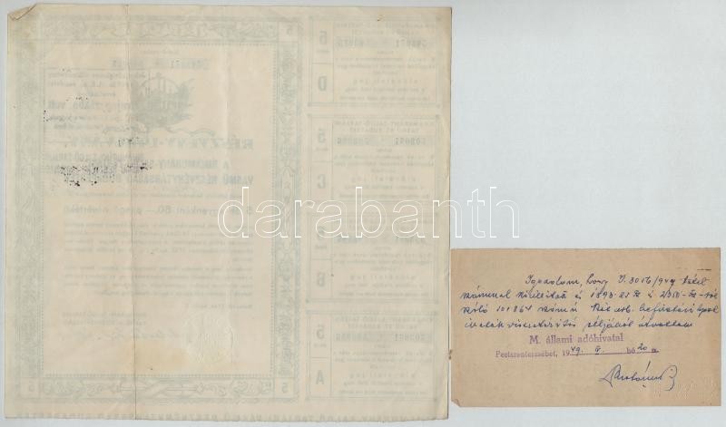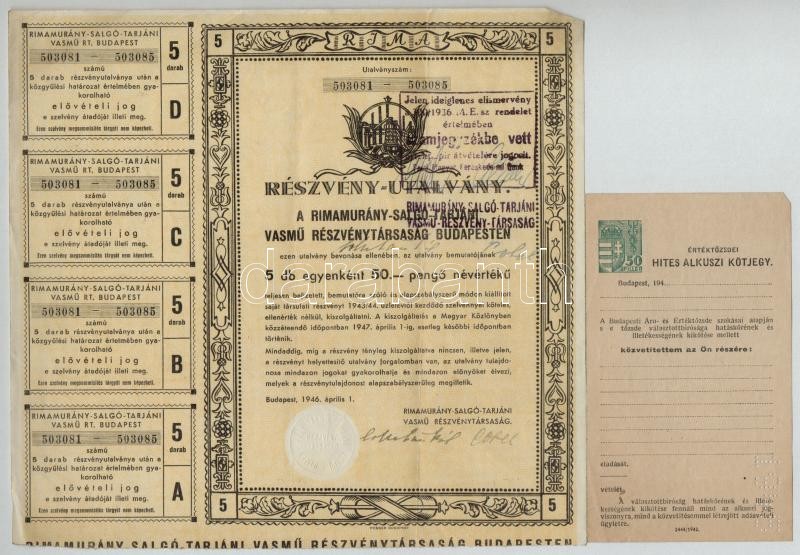 Leírás: Budapest 1925. "Rimamurány-Salgó-Tarjáni Vasmű Részvény-Társaság" tíz részvénye egyenként 50P-ről, összesen 500P-ről (4x) közte sorszámkövető pár, szárazpecséttel és bélyegzésekkel, szelvényekkel, "Budapesti Giro- és Pénztár Egylet Részvénytársaság" igazolással + Budapest 1946. "Rimamurány-Salgó-Tarjáni Vasmű Részvény-Társaság Budapesten" részvényutalványa öt darab 50P értékű részvényhez, szárazpecséttel és bélyegzésekkel, szelvényekkel + ~1940. "Értéktőzsdei Hites Alkuszi Kötjegy" kitöltetlen, hátlapon kézírásos feljegyzéssel T:III,III-