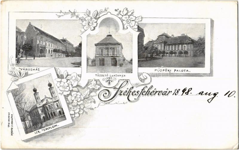 Leírás: 1898 Székesfehérvár, Városház, Püspöki palota, Tűzoltó laktanya, Izraelita templom, zsinagóga. Kaufmann F. kiadása, Art Nouveau, floral (EK)