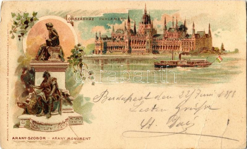Leírás: 1898 (Vorläufer!) Budapest, Országház (Parlament), Arany János-szobor. Müller & Trüb. Art Nouveau litho (EK)