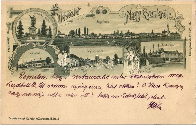Leírás: 1902 Nagycenk, Széchenyi szobor, Soproni utca, indóház, vasútállomás, Cukorgyár. Schwidernoch Károly, Art Nouveau, floral, litho