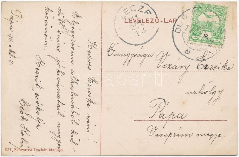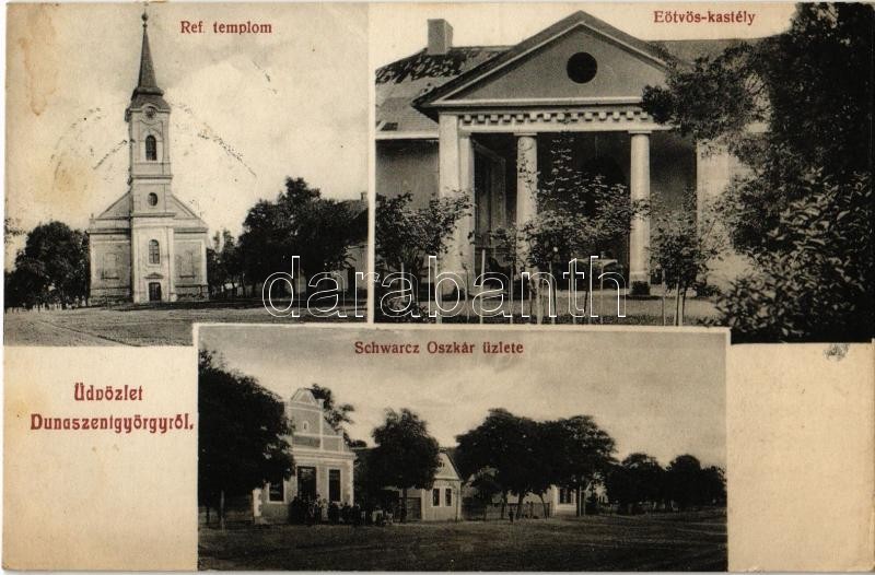 Leírás: 1911 Dunaszentgyörgy, Református templom, Eötvös kastély, Schwarcz Oszkár üzlete és saját kiadása