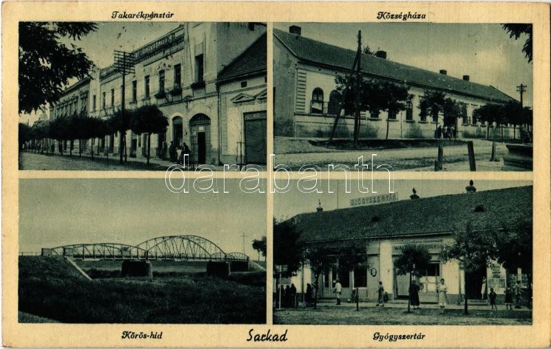 Leírás: Sarkad, községháza, takarékpénztár, Kőrös híd, gyógyszertár, W. Károly üzlete