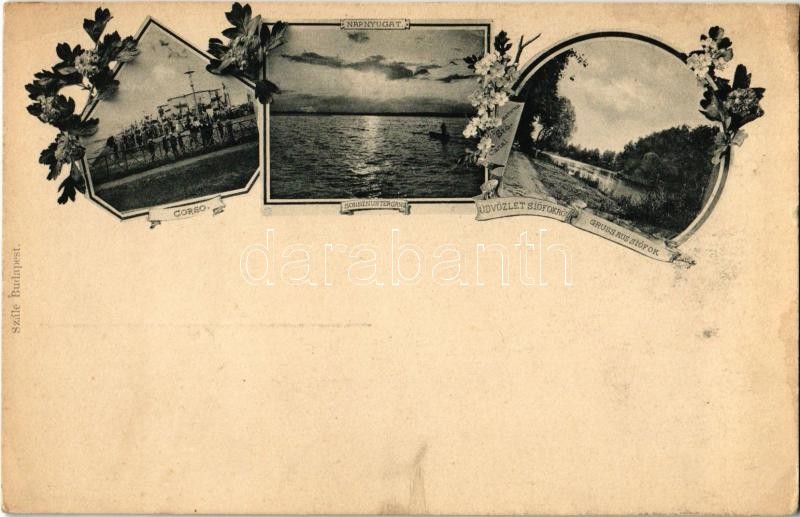Leírás: Siófok, Corso (korzó), napnyugta, Sió csatorna Kiadja Szále. Art Nouveau, floral (ragasztónyom / glue marks)