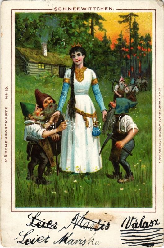 Leírás: 1899 Schneewittchen. Märchenpostkarte No. 19. Kunstanstalt Wilhelm Boehme / Snow White and the Seven Dwarfs, litho (EK)