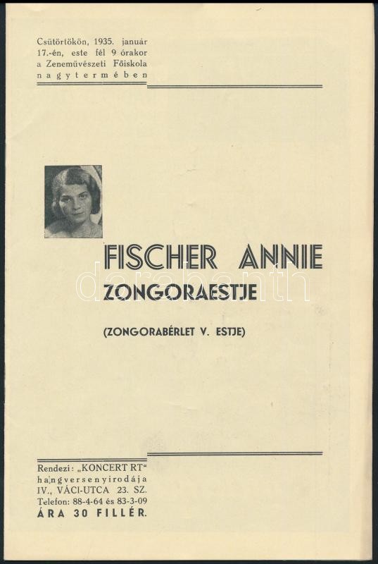 Leírás: 1935 Fischer Annie zongoraestje. Prospektus reklámokkal 16p.