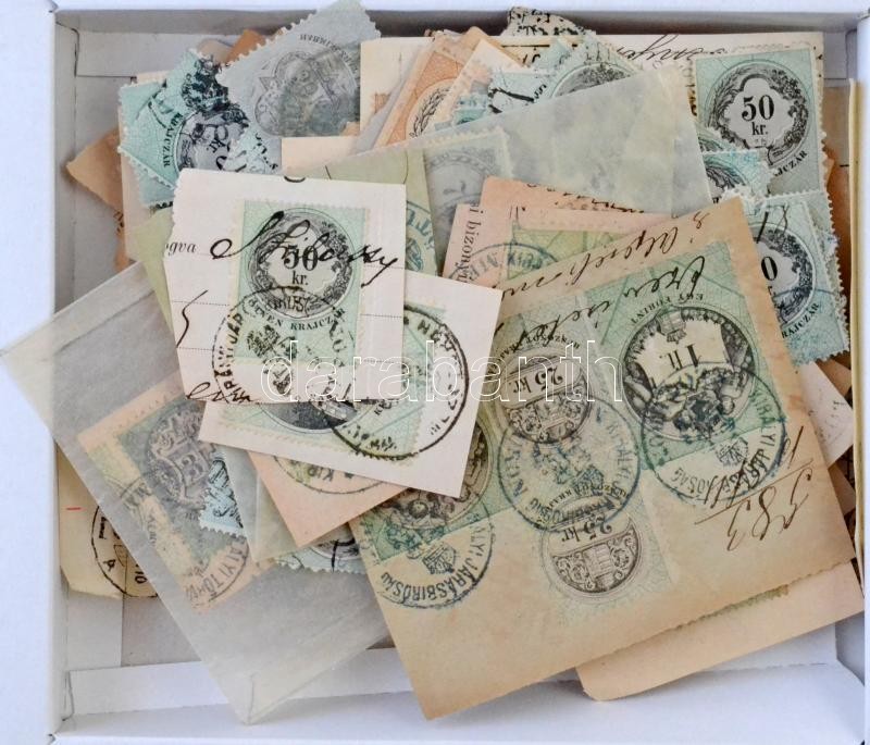 Leírás: Néhány 100 klasszikus okmánybélyeg ömlesztve dobozban, sok kivágás, szép bélyegzések 1868-1880