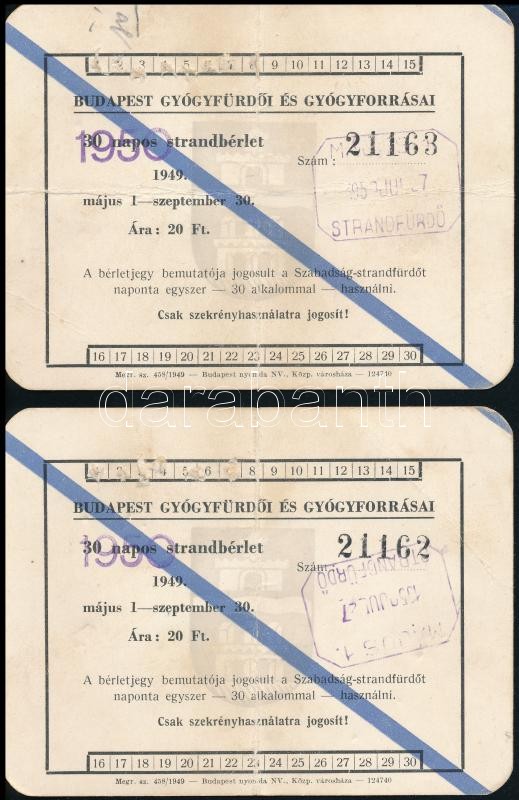 Leírás: 1950 2 db 30 napos strandbérlet, sorszámkövetőek