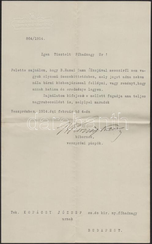 1914 Hornig Károly veszprémi püspök, bíboros gépelt, aláírt levele Kop... https://www.darabanth.com/hu/353-Gyorsarveres/353.0/Mutargy-papirregiseg-egyeb/Tortenelmi-dokumentumok-keziratok-erdekessegek~500032/1914-Hornig-Karoly-veszpremi-puspok-biboros-gepelt-alairt-levele-Kopacsy-Jozsef-fohadna~II2014547
