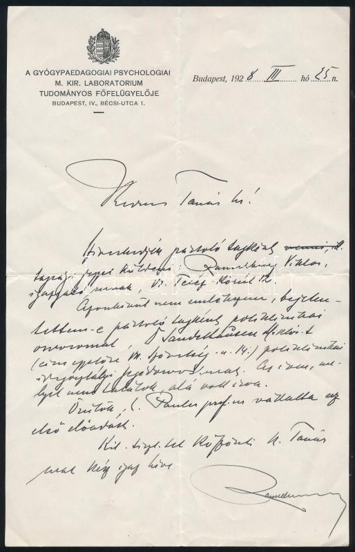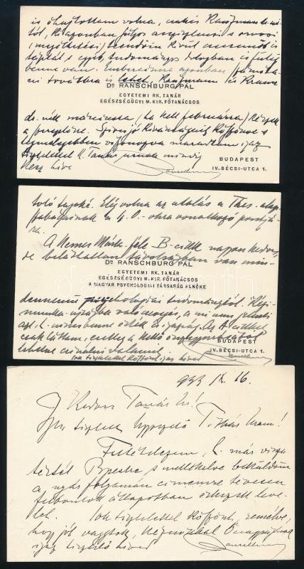 1927-1934 Ranschburg Pál (1870-1945) elme- és idegorvos, pszichológus 46 db levele, levelezőlapja, névjegye, stb., saját kezű soraival Boda István (1894-1979) részére