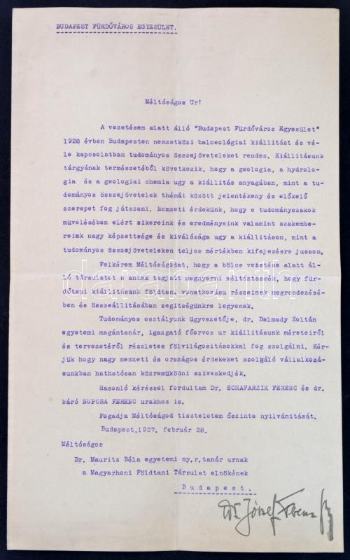 Leírás: 1927 József főherceg saját kézzel aláírt levele, mint a Budapest Fürdőváros Egyesület elnöke.