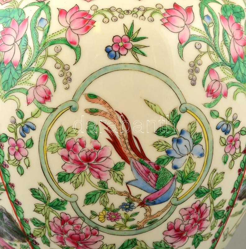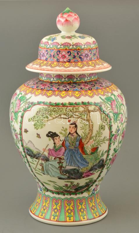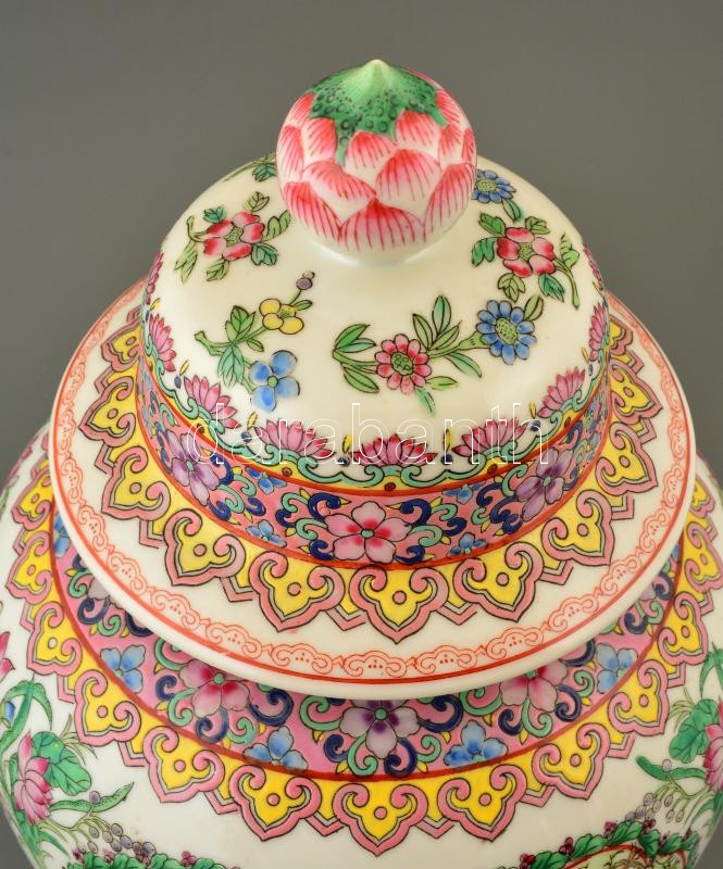 Leírás: Jelzett kínai Famille rose fedeles urnaváza, kézzel festett, apró kopás nyomokkal, m:42 cm