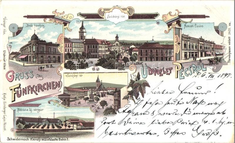 1898 Pécs, Fünfkirchen; Bedő kávéház, Széchenyi tér, Nemzeti Casino, Abbazia új sörgyár. Schwidernoch Károly műintézete. Kiadja Günsberger Lajos 3409. sz. Floral, Art Nouveau, litho (vágott / cut)