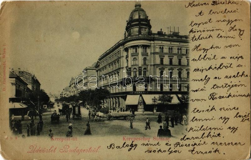 1901 Budapest VIII. Kerepesi út (Rákóczi út), Nemzeti Színház és bérháza, lóvasút, Szikszay Ferenc étterme és kávéháza, Hollandi életbiztosító részvénytársaság. D. Halberstadt kiadása (kopott sarkak / worn corners)