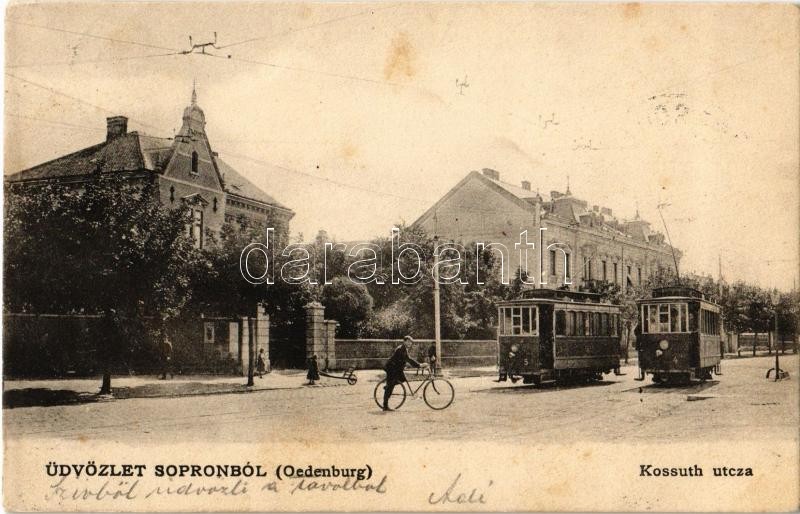 1904 Sopron, Oedenburg; Kossuth utca, villamosok, kerékpáros https://www.darabanth.com/hu/354-Gyorsarveres/354.0/Kepeslapok/Magyarorszag~1000005/1904-Sopron-Oedenburg-Kossuth-utca-villamosok-kerekparos~II2022161