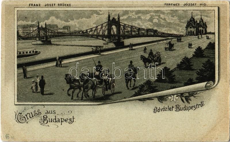 Budapest, Ferenc József híd, hintók és járókelők. Art Nouveau, floral,... https://www.darabanth.com/hu/354-Gyorsarveres/354.0/Kepeslapok/Magyarorszag~1000005/Budapest-Ferenc-Jozsef-hid-hintok-es-jarokelok-Art-Nouveau-floral-litho-Rb~II2024021