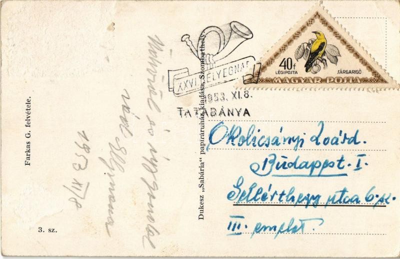 Leírás: Szombathely, strand, fürdőzők, napozók. Dukesz "Sabaria" kiadása. Farkas G. felvétele + "1953 XXVI. BÉLYEGNAP TATABÁNYA" So. Stpl. + 40f légiposta (Rb)