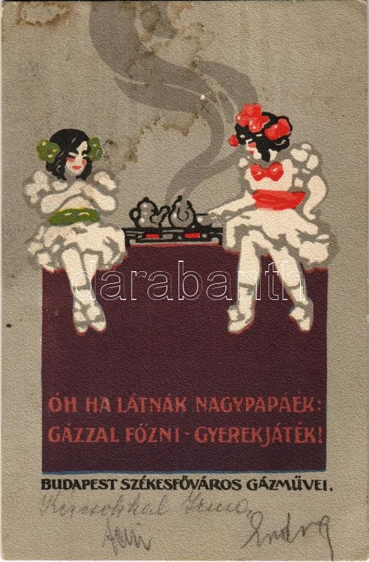Leírás: 1914 Óh ha látnák nagypapáék: gázzal főzni - gyerekjáték! Budapest Székesfőváros Gázművei reklámlapja / Hungarian gasworks advertisement card (fl)