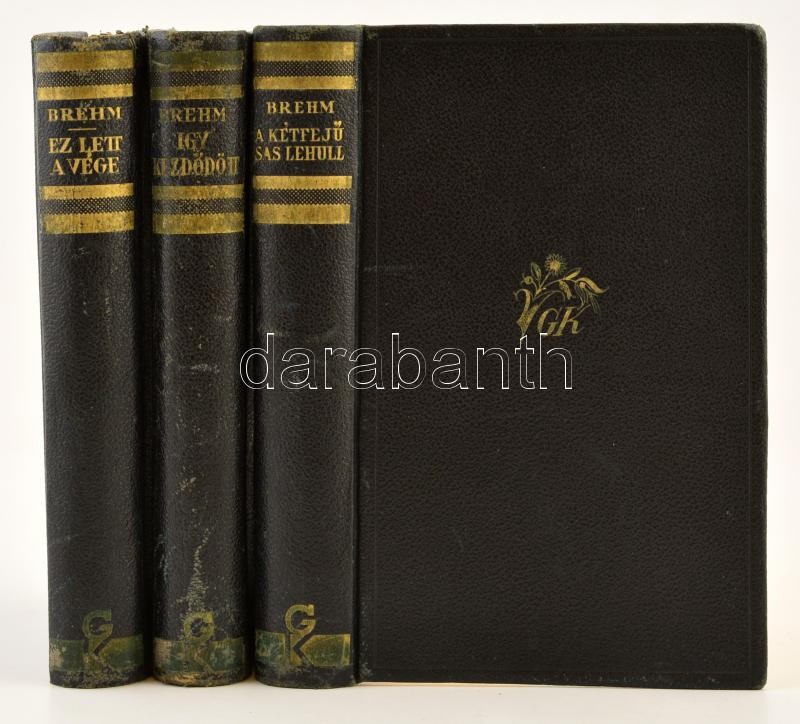 Bruno Brehm sorozat (A magyar nemzet tragédiájának regényes korrajza. Ferenc Ferdinánd meggyilkolásától a békekötésig): Így kezdődött, A kétfejű sas lehull, Ez lett a vége. Bp., 1938 Grill Károly. Aranyozott egészvászon kötésben, jó állapotban