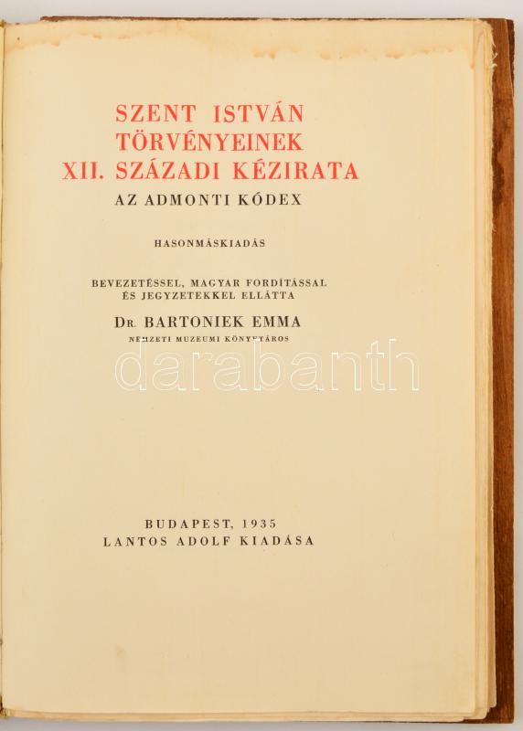 Szent István törvényeinek XII. századi kézirata. Admonti Kódex. Hasonmás kiadás. Bevezetéssel, magyar fordítással, és jegyzetekkel ellátta: Dr. Bartoniek Emma. Magyar Nemzeti Múzeum Országos Széchényi Könyvtára Nemzeti Kincseinek Hasonmásai. I. köt. Bp.,1935, Lantos Adolf, 69+(1)p.+8 sztl. lev. Fatáblás, félbőr-kötésben, foltos, kopott, kissé sérült táblákkal. Számozott (116./300) és Fitz József által aláírt példány.