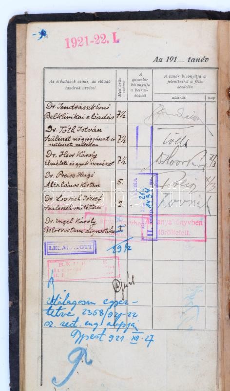 Leírás: 1920 Orvostanhallgató leckekönyve nagy nevek, pl: Ríbár, Lenhossék, Pólya, Korányi Sándor és mások aláírásaival. Megviselt borítóval