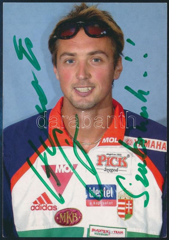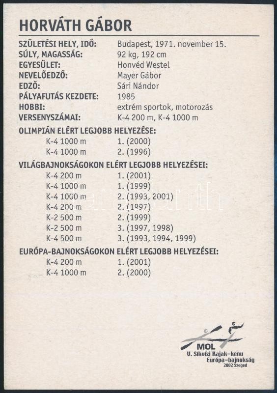 Leírás: Horváth Gábor olimpiai bajnok kajakozó aláírása őt ábrázoló fotólapon