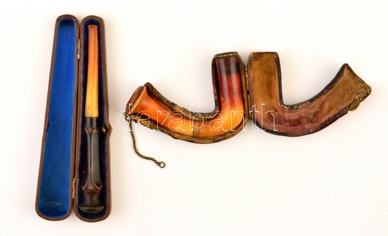 Leírás: 2 db régi tajtékpipa és tajtékszipka, tokban, h: 13 cm és 8,5 cm