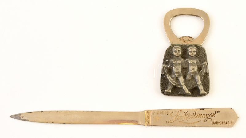 Leírás: Fém sörnyitó és levélbontó, 2 db, h: 7 és 18 cm