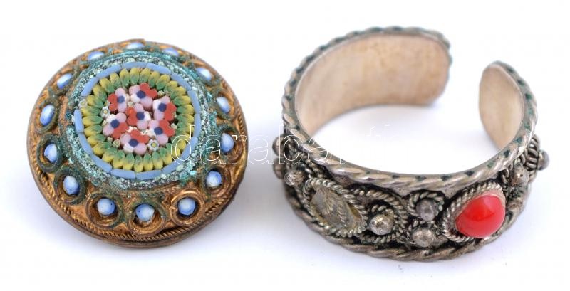 Leírás: Filigrán díszítésű ezüst(Ag) gyűrű + mozaikos díszítésű kitűző, d: 1,8 cm