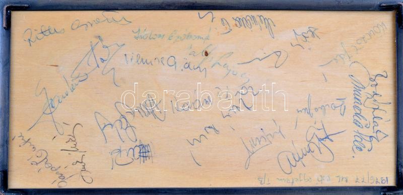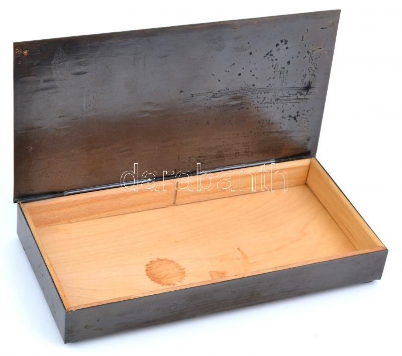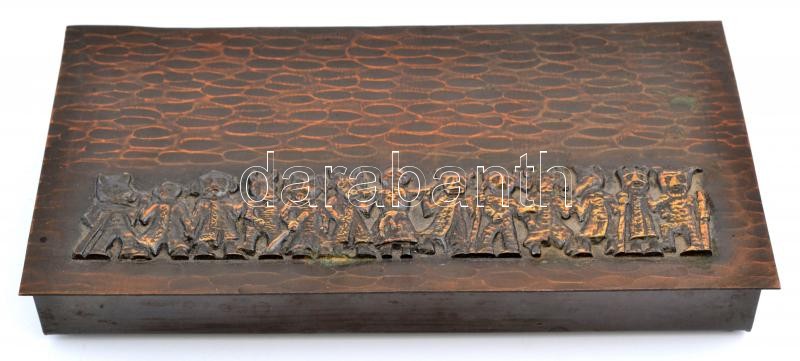 Leírás: Iparművész réz doboz, figurális díszítéssel, alján aláírásokkal, 20,5×10,5×3 cm