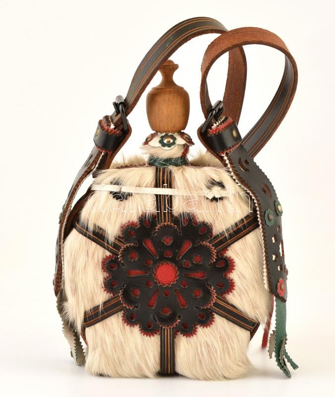 Leírás: Népművészeti csikóbőr kulacs, jó állapotban, m: 28,5 cm