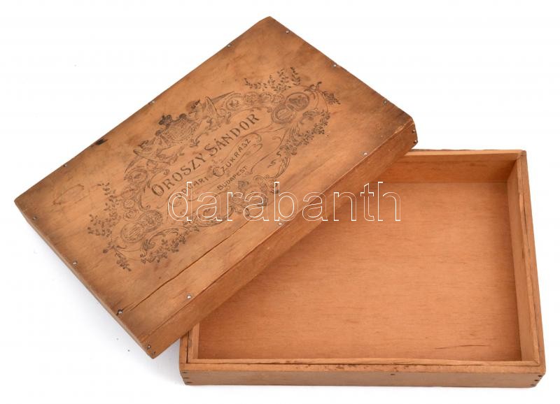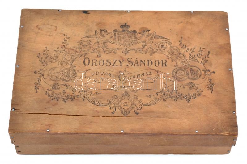 Oroszy Sándor udvari cukrász Budapest süteménytartó fa doboz, sérült, ... https://www.darabanth.com/hu/354-Gyorsarveres/354.0/Mutargy-papirregiseg-egyeb/Bolhapiac~500012/Oroszy-Sandor-udvari-cukrasz-Budapest-sutemenytarto-fa-doboz-serult-13C39719C3975-5-cm~II2021025